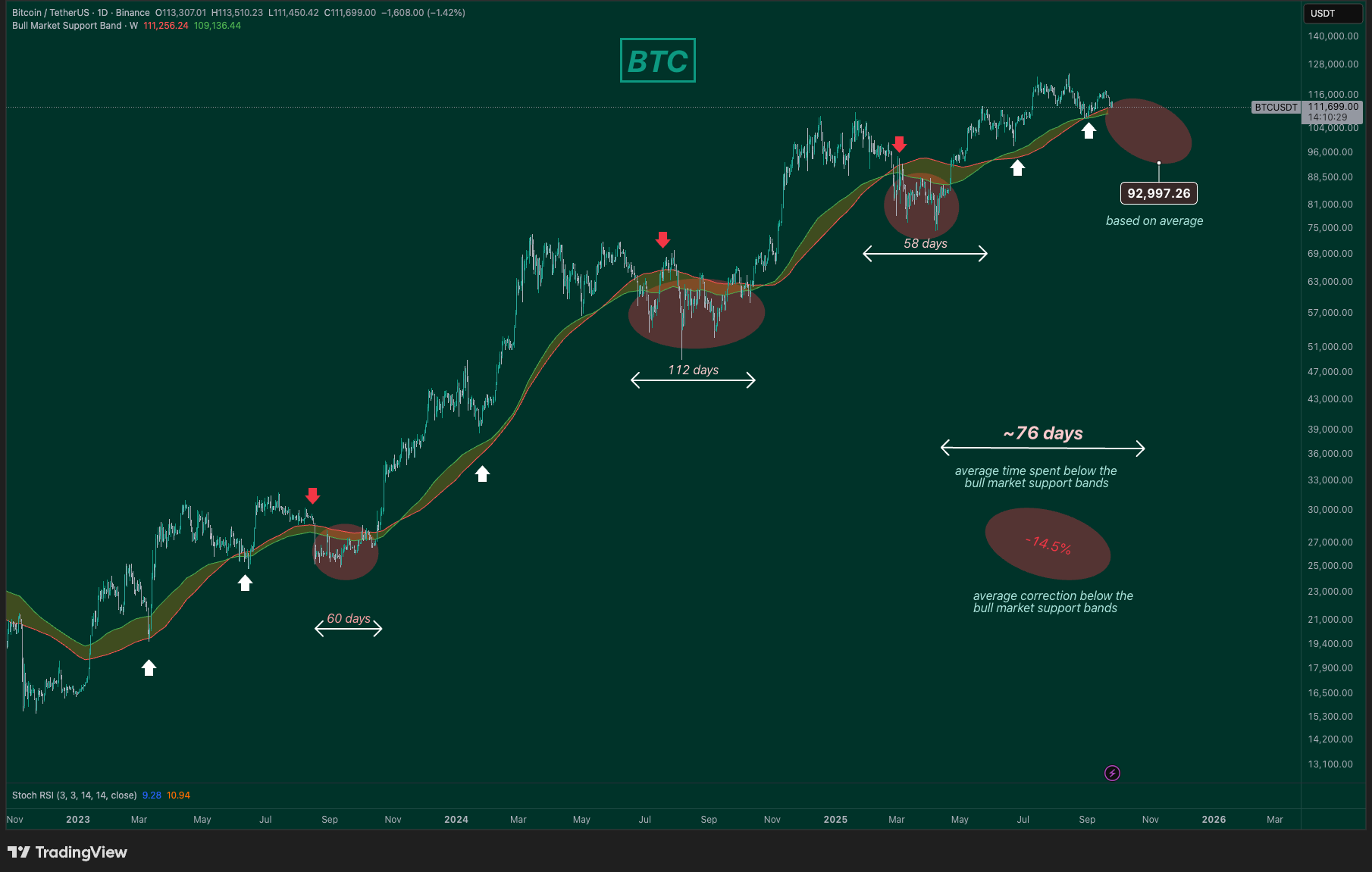 Average time spent below the bull market support bands: ~76 days