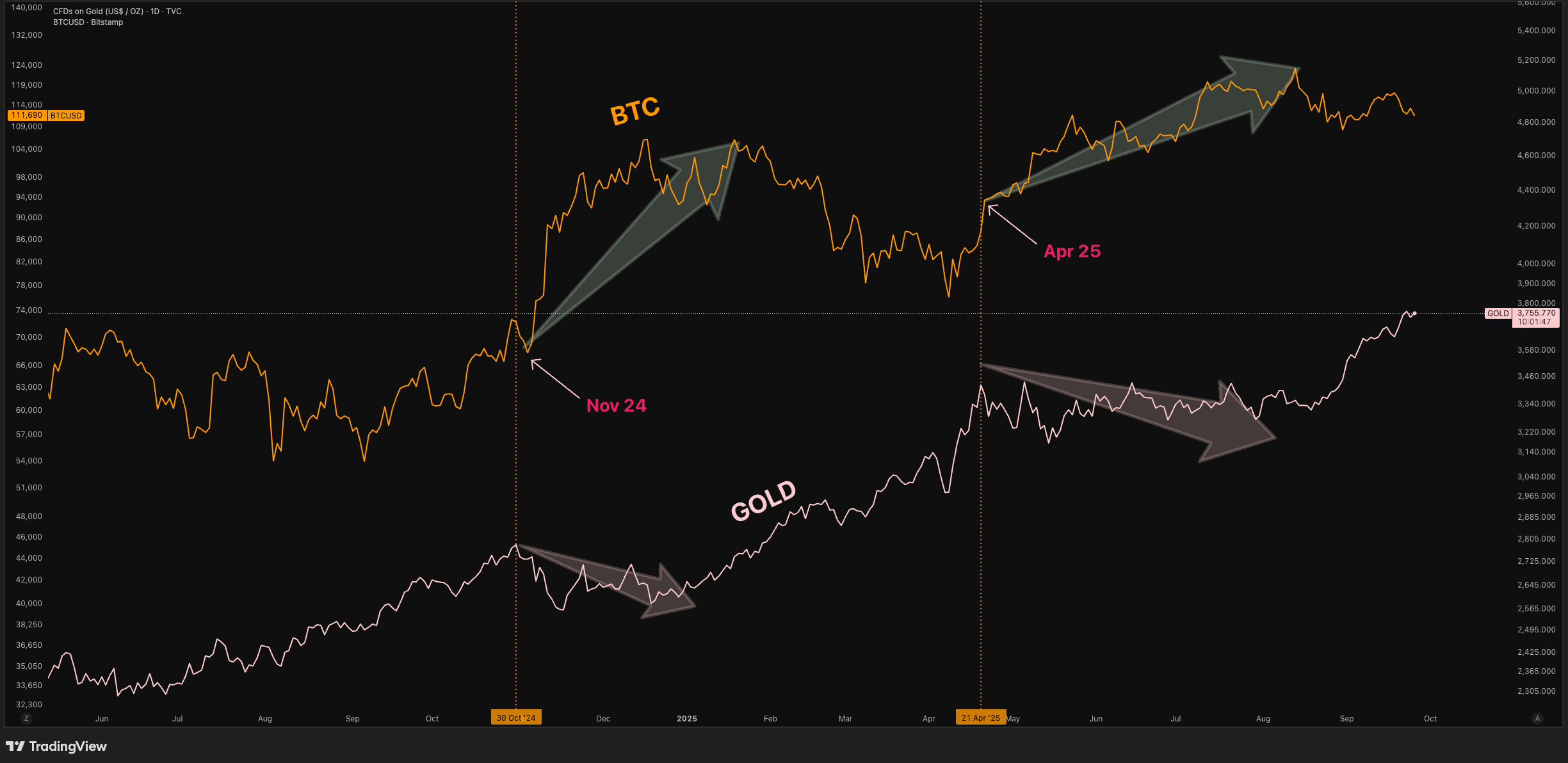 Another recent point we looked at is gold. Usually, gold moves before Bitcoin rallies. Could a pattern like the one below play out soon?