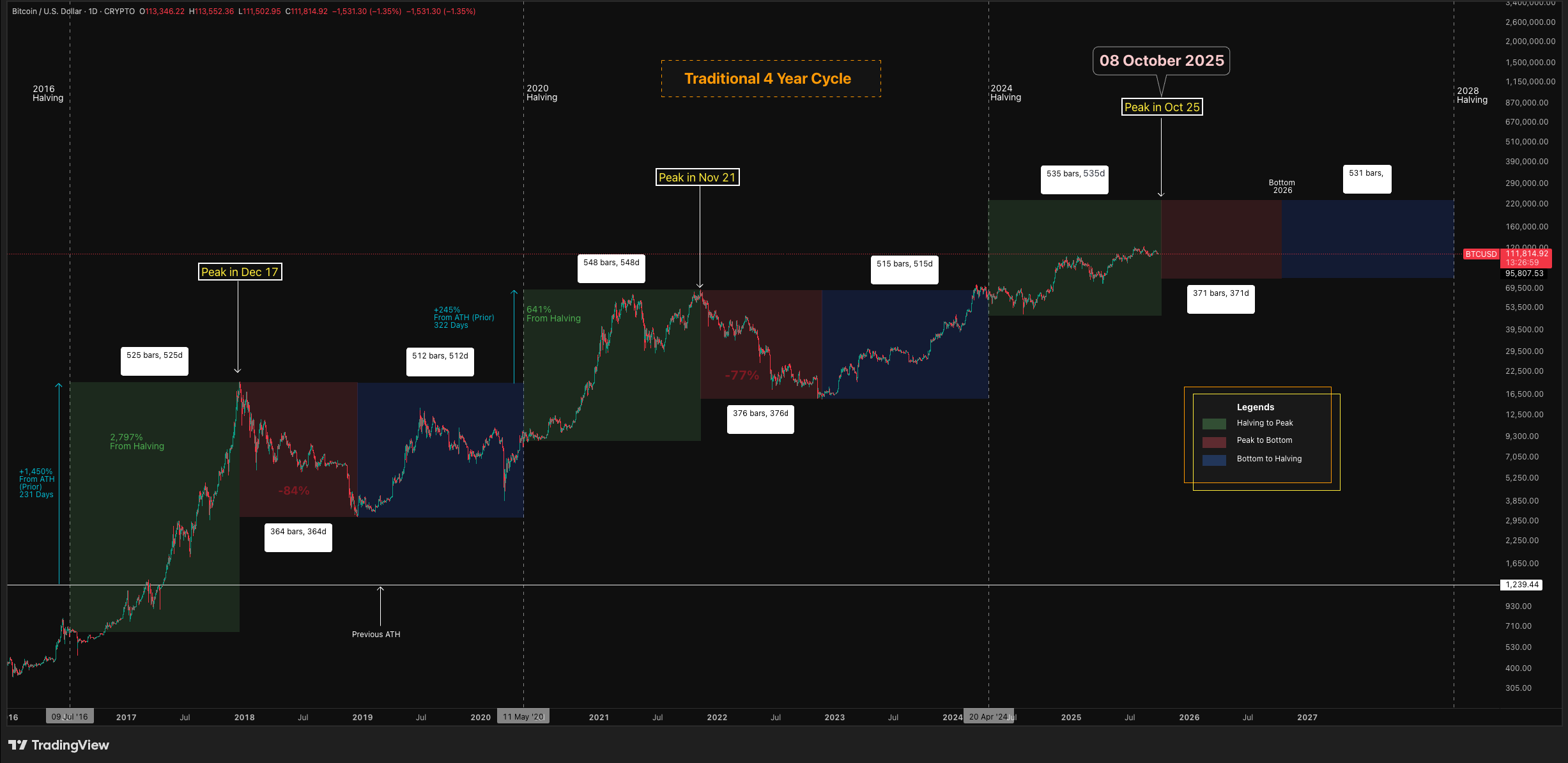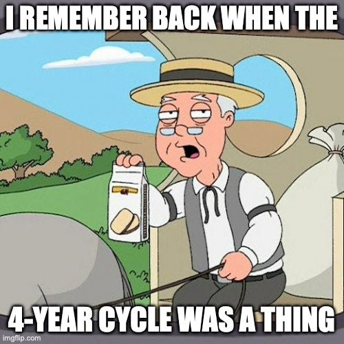 Thereās a lot of fear in the market right now, and it may be because weāre about two weeks away from invalidating the four-year cycle theory. And thatās a big one. Many see the four-year cycle as ālawā. Weāve talked about this recentlyāhow people who believe the four-year cycle repeats are likely starting to take profits, if they havenāt already. This has caused a tug of war between long-term holders taking profits and institutions slowly accumulating Bitcoin and other crypto.