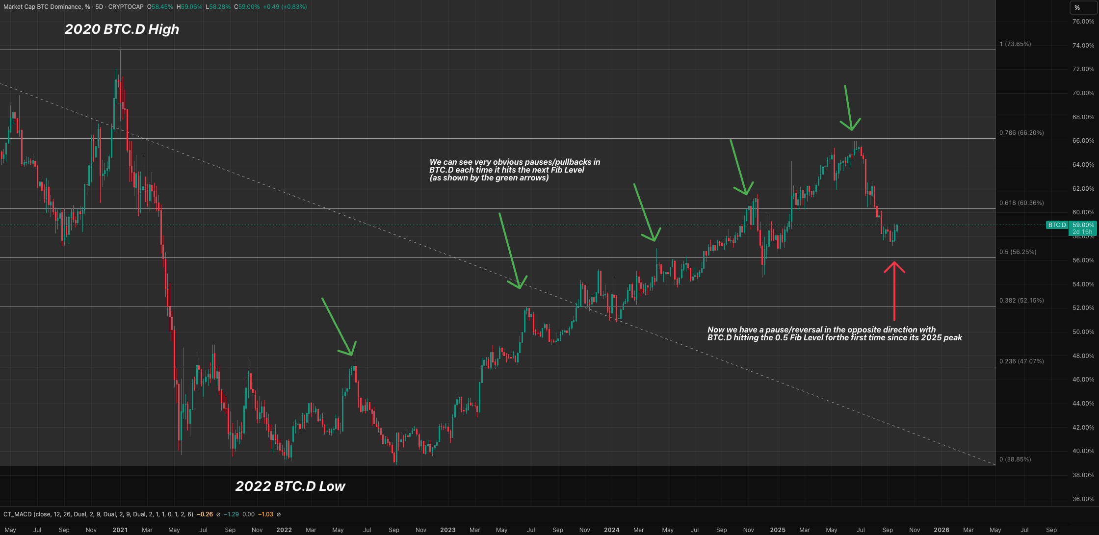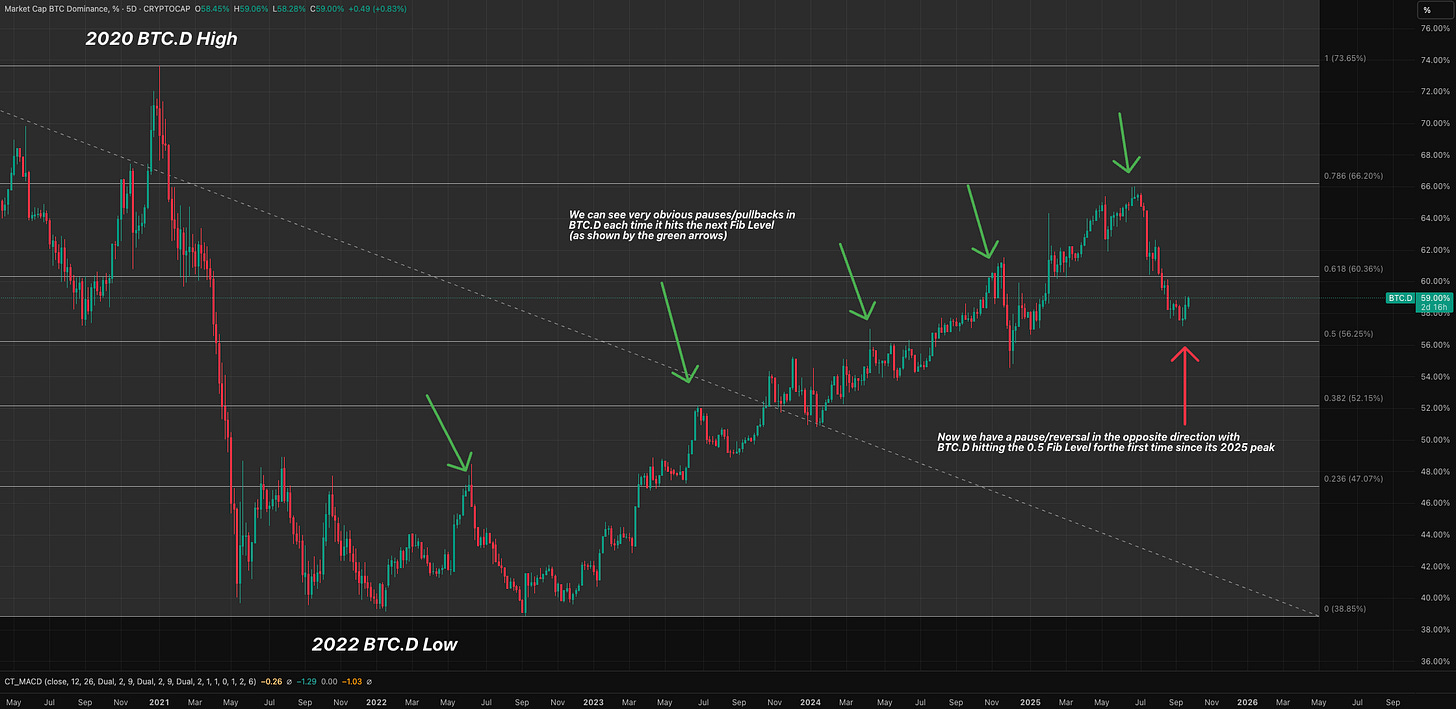 A bad time for risk-on often means altcoins get hit the hardest. And this becomes evidently worse for alts when you consider October is historically one of the best months for Bitcoin dominance (BTC.D). If BTC.D rises, altcoins feel the pain. Right now, Bitcoin dominance is indeed forming a low on its chart. According to our analysis, it could reach up towards 60.35% next.
