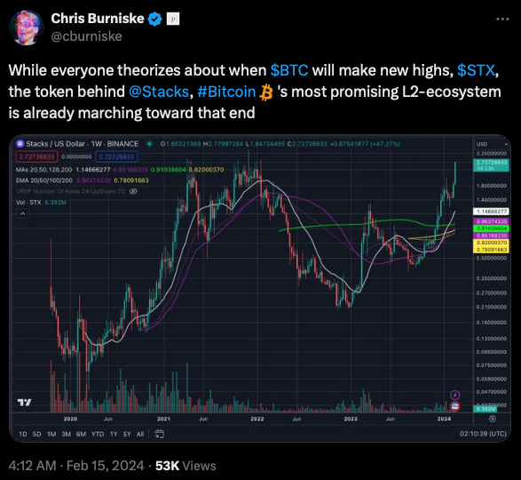While at the same time Stacks (STX) is showing massive strength. There’s speculation that if Stacks breaks its all time highs, it’s going to kick-start a Bitcoin L2 season.